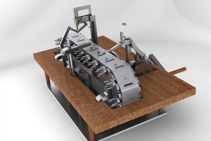 Worker number three has the distinction of having two metal arms. A 4-bar-like mechanism gives her a human-like hammering motion, which is controlled and timed by a cam.