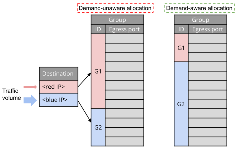 Idea 1: De-duplication . Recall that packets destined for different IP addresses are handled by different groups, as Figure 3 shows. But what if these “different groups” actually appear identical? Namely, the groups contain the same set of ports, and the weights for each port are also identical. This situation is not uncommon, especially after group reduction, where groups can become identical. In such cases, de-duplicating these identical groups and reusing a single instance allows for a more efficient use of the limited memory space available in switches.