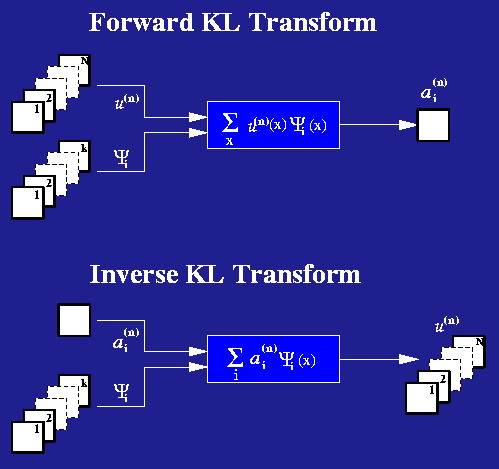 The empirical eigenfunctions of the K-L procedure can be used to decompose the dataset from which they are calculated. In the diagram above, the forward transform and inverse transform are shown.