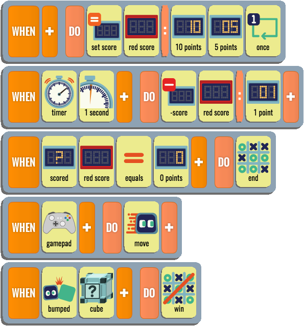 5. Fixed-Duration Continuous ActionsFixed-duration continuous actions are a variant of the timeout escape paradigm. We can begin a continuous action that normally runs forever, and use a timer to terminate it by switching pages. An example is conducting some limited exploration using "move wander". Suppose we want to have cubes in the world map, and if we don't find them, we want to wander around for a certain interval and then go back to page 1 and consider what we found. We can do this by using a timer to escape the wandering behavior. Note that "move wander" can't be tied to the timer rule. It is a top level rule that runs independently. The timer limits wandering by leaving the page.6. Timer ResetSwitching pages resets any timers, even if we're switching from a page to itself. Here's a little game where you have to press the A button at least once every 5 seconds to reset the timer. If you don't reset it, you will lose.7. Interaction With the 3rd and 5th LawsWhen a timer expires and any associated action succeeds, the rules indented below that timer rule can run; this is the Fourth Law. The indented rules are subject to the same laws, which leads to the following interesting example for making a character repeatedly glow red, then green, then blue:The first time the timer expires, the "glow me red" rule runs. Two seconds later the timer expires again. Now the "glow me green" rule can run, and it does. According to the 5th law, this enables the "glow me blue" rule to run, and it does, but the glow me blue action is overridden by the preceding rule's "glow me green" action, in accordance with the Third Law. The "glow me red" rule's action is overridden by "glow me green" rule for the same reason. The second time the timer expires, the character is glowing green. The "glow me blue" rule can run, and it does. The "glow me red" rule can also run but its action is again overridden. The third time the timer expires, the character is glowing blue, so the only rule that can run is the "glow me red" rule, and the cycle repeats. Dependent Timer RulesDependent timer rules have the timer indented under another rule, so the timer only starts to run when the parent rule's WHEN condition is true and its action succeeds. The parent's WHEN condition must remain true on every rule cycle until the timer expires; otherwise the timer will be reset. The main use of dependent timers is to test for an enduring condition.1. Test for Enduring ConditionSuppose we want to require the user to hold down the A button for 3 seconds in order to switch to another page. When the button is pressed, the indented timer rule should start the timer running. As long as the button remains pressed, the timer keeps running, and when it expires, the page swith occurs. If the button is released before the timer expires, the timer rule stops running. Pressing the button again will cause the time to start afresh.Here's another example of this idea. This time we'll use the gamepad A button to glow a cube green for 3 seconds. The condition of being green triggers a dependent timer that will eventually shut off the glow. 2. Timers are momentary, not enduringWhile a timer is running it is not considered to be "true", so any rules indented beneath it cannot run. Thus, you cannot use a timer as the parent rule to test for an enduring condition. Suppose we want the robot to complain whenever it goes 10 seconds without seeing a cube. The following program will not work as intended:What the above rules do is check every 10 seconds for the camera image to have no cubes in it. There is no measurement of how long the cube has been missing. If the cube disappeared one second before the timer expired, this rule would complain, although it should be silent. The correct solution is to have the timer rule depend on the visibility check instead of the other way around: Now the timer starts when there is no cube in the camera frame, and only if this condition persists for 10 seconds will the timer have a chance to expire and trigger the "say" action, as we intended. Advanced Timer ConceptsTimers are a fairly sophisticated concept because of their interaction with other rules and the changing state of the world. Below are some interesting observations about how timers work:The "Once" Tile Cannot Be Used With A Timer."Once" allows an action to be performed only once while the rule's WHEN condition remains true. The "once" flag is reset when the condition becomes false, so the next time the condition becomes true the action will be performed again. "Once" cannot be used with a timer, because timer conditions are never true for more than a single rule cycle. Thus, the "once" flag will always be reset immediately. In effect, the "once" tile is meaningless in this context. The following code will say "banana" over and over, not just once:If our intention is for the entire rule to only run once, the easiest solution is to use use a page switch to prevent the timer from restarting: Timers Don't NestIt is not possible to nest one timer inside another. Again, the reason is that timer predicates are only true for an instant, so any timer nested inside a parent timer rule would be reset on the very next rule cycle. Suppose that every 8 seconds we want cube 1 to flash red for two seconds. The following code will not work:When the first rule glows the cube red, the second timer will start to run, but it will be reset on the next rule cycle, so the timer will never get a chance to expire. One way to implement this behavior correctly is with a state machine. We stay in the "glow red" state for two seconds and then switch to the "glow none" state for 6 seconds, for a total period of 8 seconds. But it is also possible to implement this behavior in a single page by using the cube's color to trigger a dependent timer. This is another example of testing for an enduring condition: Note that the second timer's period must be 8 seconds, not 6 seconds, because now the timers