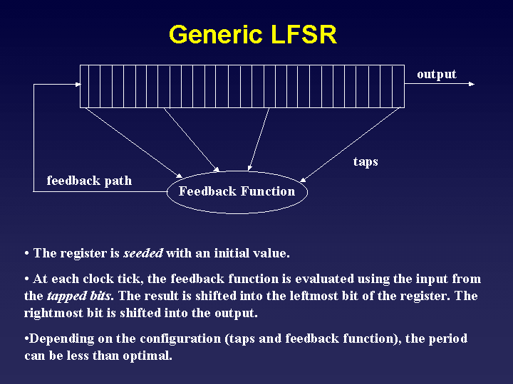 An LFSR is seeded with an initial value. With each clock tick, certain tapped bits of the LFRS are evaluated by a feedback function. The output of this feedback function is then shifted into the register. The output of the register is the bit that is shifted out. This process is illustrated in the slide below: