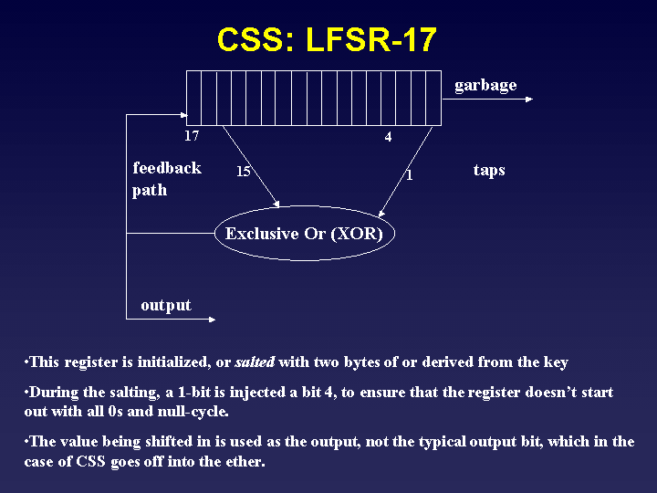 As we'll discuss shortly, CSS is based on two Linear Feedback Shift Registers (LFSRs). Although very efficient in hardware, LFSRs are somewhat inefficient to implement in software, and there are some interesting programming techniques that are used to speed up the process. Unfortunately, I do not believe it is lawful for me to show that code, or equivalent code, to you today -- for that reason, I will not. Unfortunately, the same concern leads me to suggest that you refrain from reviewing the DeCSS source code after this lecture. Unlike my suggestion to review an implementation of DES, obtaining source code for DeCSS may well violate federal law. So today, you will literally get, "As much of an education as the law allows -- and no more."