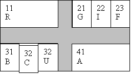 shuffle.inMTU, Inc., is a multi-national software developer with office buildings in several cities. As part of a corporate reorganization, the company’s leaders are changing employee office assignments. Employees will remain in the same office building. Consider the Milledgeville office with employees A, B, C, F, G, I, R, and U as depicted below (the hallways are shaded, and the office numbers are indicated above the employee names).