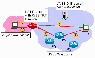4. Consider the figure above. When any Internet host A wishes to communicate with an AVES host, e.g. pc.john.avesnet.net, A simply performs a host name lookup (arrow (1)). When the AVES domain name server receives this lookup request, it contacts one of the AVES Waypoints, in this case W1 (arrow (2)), to set it up. A confirmation is then received from W1 (arrow (3)). Finally, the AVES domain name server returns the IP address of W1 to A (arrow (4)).