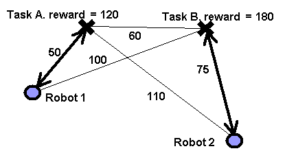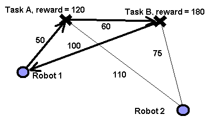 Figure 1: An illustration of simple reasoning. The robots incur costs in driving, as indicated by the numerical labels in Figure 1. The robots bid on each of the tasks. The robots are only smart enough to reason about single city tours. Robot 1 bids the cost plus a profit of 20 for task A (120). Robot 2 cannot compete for this task since its costs alone are 220. Robot 1 wins task A. For similar reasons, Robot 2 wins Task B. Both robots are happy, since each makes a profit. The user is happy, since the task is accomplished with a reasonable solution.