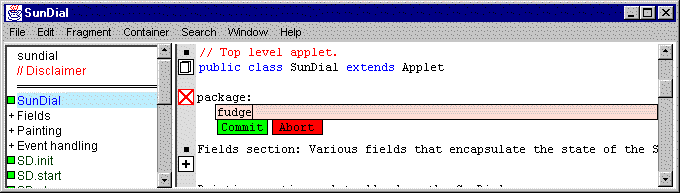 The pink color of an fragment being edited helps to to remind you that editing is incomplete. All fragments being edited also appear in the Fragment Edits window, which helps to keep track of multiple edits in progress. The ability to have several uncommitted edits makes it easy to back out of an exploratory modification which spans several fragments. (If you have too many uncommitted edits, you can use the Window/Commit Edits command in the Fragment Edits to commit them all at once.)