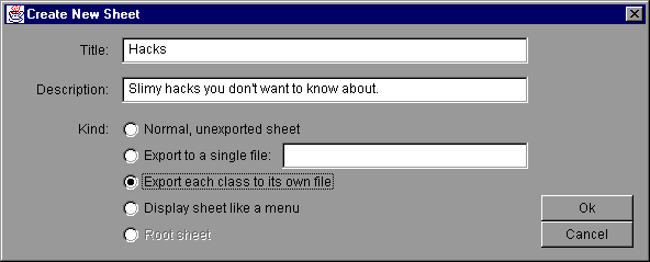 set compile-command "nmake " set recompile-command "nmake recompile"(If you are on a non-Windows machine you should remember to specify an absolute pathname for your "make" utility.) When you export files, Sheets will create a file named export-map.mak, which is useful for including in makefiles. It defines two makefile variables, EXPORTED_SRCS and EXPORTED_OBJS. EXPORTED_SRCS is all filenames that were exported since Sheets was started. EXPORTED_OBJS is the name of the object files that correspond to the source files exported. For example, if you exported Foo.java and Bar.java, then export-map.mak would look like