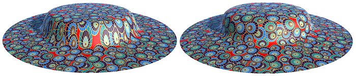 Left: even for modest displacements, simple normal offsets can severely distort texture. Right: using a spin transformation to apply displacement prevents distortion.