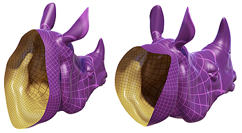 The boundary of a surface (left) can be modified without disrupting texture or geometric detail (right).