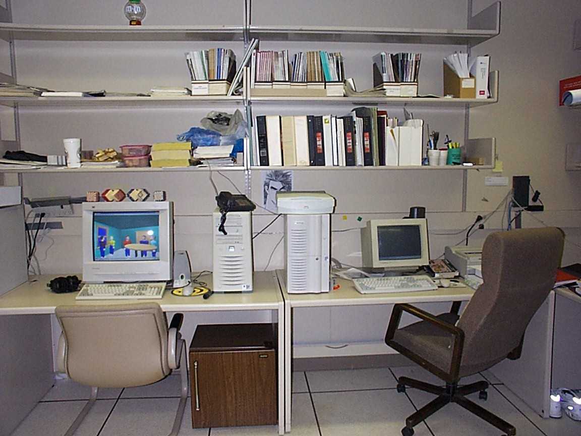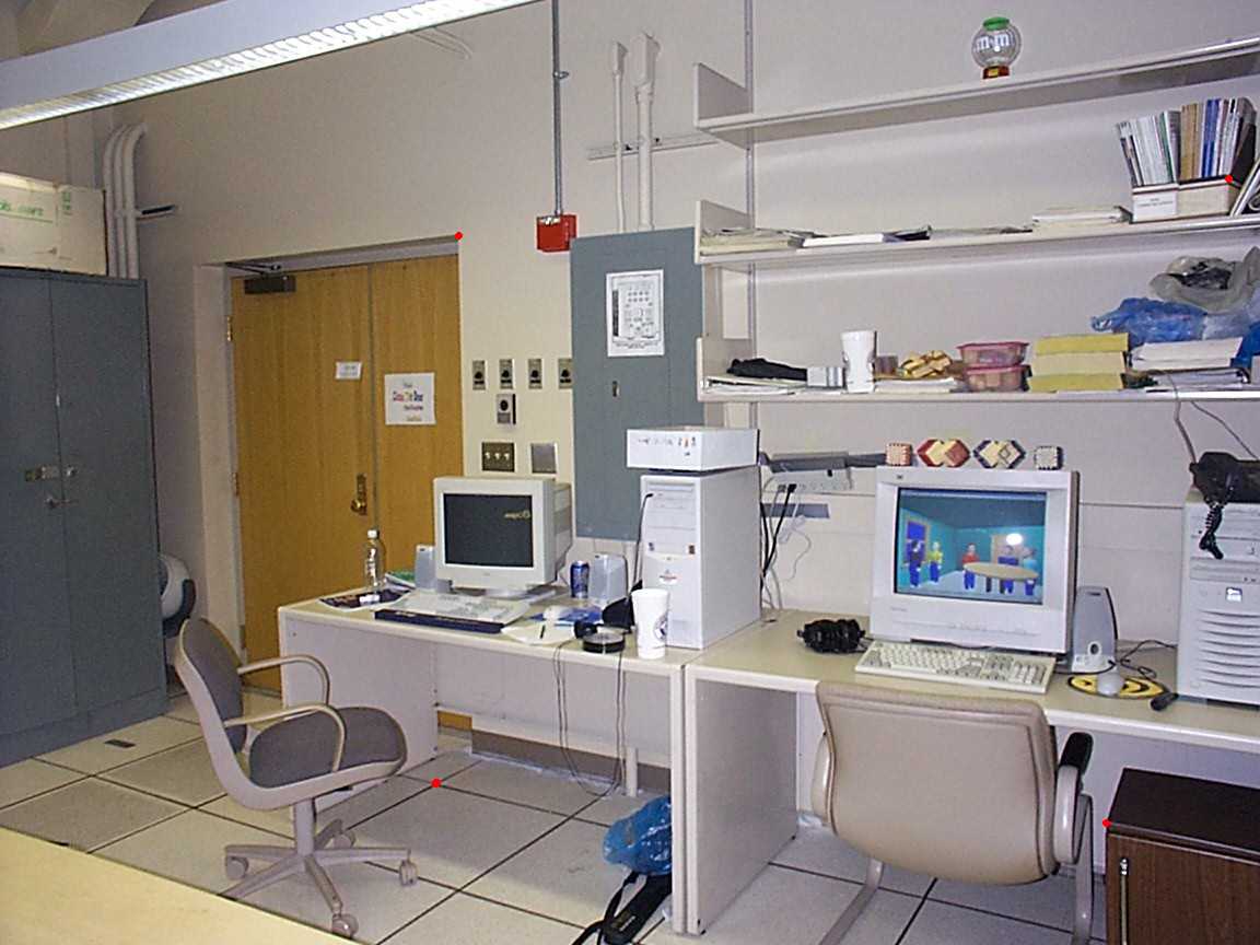 The following are the 2 views of my lab taken by a digital camera with resolution 1152 pixel x 864 pixel. The 4 red dots on each image are the corresponding points used to solve for the parameters on the next stage.