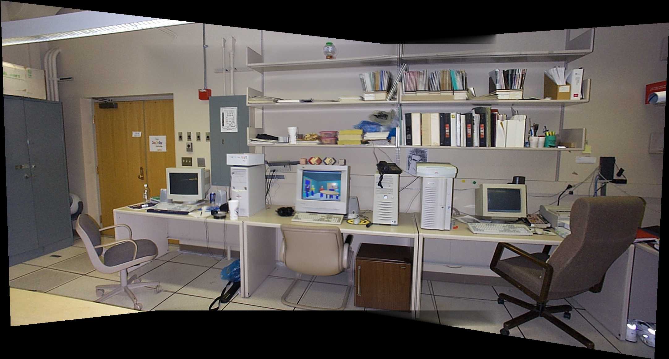 After the registration, the parameters of the projective mapping are calculated by implementing the algorithm specified in the Prof Heckbert's paper Projective Mappings for Image Warping. I choose to warp the left image into into the projection of the right image. Then after knowing the parameters for the projective mapping, the four corners of the left image are transformed. This information together with the four corners of the right image, determine the size of the composite image. After finding the size of the new composite image, each pixel is then calculated by using a scanline method. For each pixel on the new composite image, first the corresponding coordinate on the left image is found by backward projection. Then bilinear interpolation is used to compute its pixel value on a sub-pixel resolution level. Secondly, the corresponding coordinate on the right image is found by a simple translation, and no interpolation is required to calculate its pixel value since this image is unwarped. Then the pixel obtained from the left image and the pixel obtained from the right image are weighted according to the distance to the center of the corresponding image. The weight is chosen to assume a value of 1 on the image center and a value of 0 on the edge and outside of the image. Then the new pixel value is the weighted sum of those two pixels. After repeating this process for each pixel, we obtain a new composite image as follows: