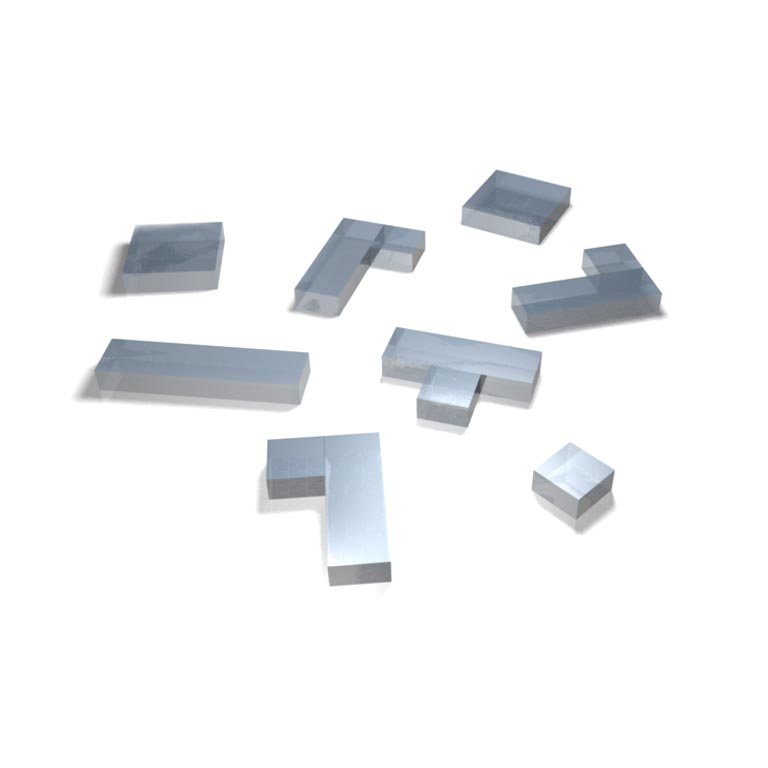 Crystal Tetris is a very simple game to create. All that is necessary are five different shaped molds for the pieces and the material to create them. Even though making the pieces out of glass would make this game extremely attractive, that would only be feasible for a older audience; for a child's protection and preventing shattering of the pieces, some translucent form of plastic would be the best material to use. This way, making the pieces would be very simple and cost effective, and there would be control over the sizing of the pieces. Also for a child's safety, the pieces should be made large enough such that swallowing them would not be an issue.