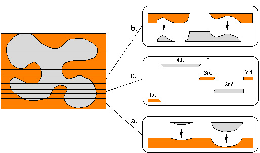 First a layer of part material or the support material that is not undercut is applied until the geometery demands otherwise. Undercut is when two types of material occupy the same horizintal position and different verticle positions at the same time. So the bottom layer must be applied first. Obviously the application order is paramount. The graphic below demonstrates the order of deposition in a several layers of one part.