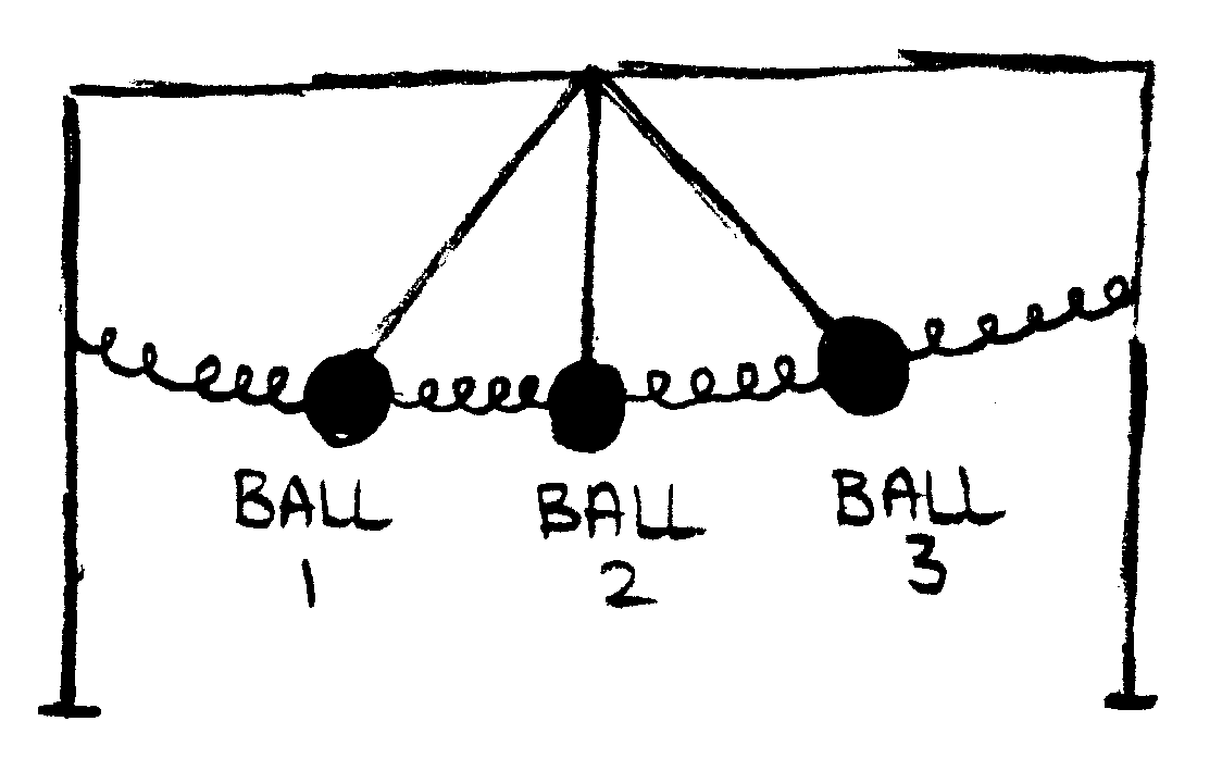 This desktop toy is based upon the toy/educational device known as a Newton's Cradle. While the Newton's Cradle demonstrates transference of momentum and conversion of potential energy to kinetic energy, this toy incorporates springs between the balls as seen in the following sketch. Adding these springs allows for the conversion of potential energy to stored spring energy. Also, by plucking any of the three balls, a wave can be generated in a front to back fashion or a side-to-side oscillation can be established. The direction of motion depends only on the direction in which the first ball is tugged.