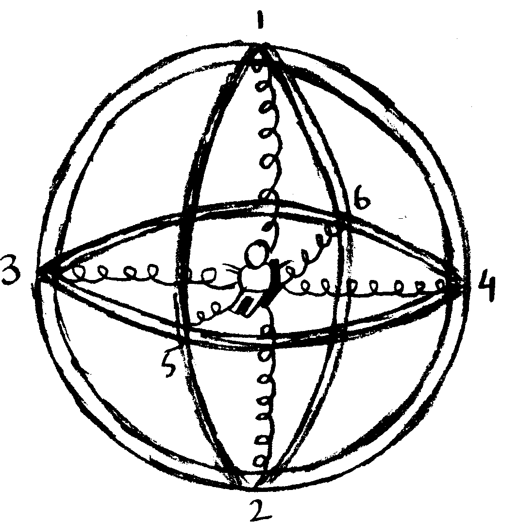 This is a variation on a normal ball that incorporates the physical principles of motion due to expanding and compressing springs. Its main structure consists of three interlocking plastic rings. At each of the six interlocking points (which are indicated in the sketch of the toy), a spring is attached which has its other end attached to a chair in the center of the ball. On this chair is seated a little toy man who is free to move with the chair in any direction as dictated by the compression or expansion of the springs. To allow the toy to be more like a ball, the open space is covered with transparent plastic. This allows children to freely roll the ball while allowing them to watch the inner motion at all times.