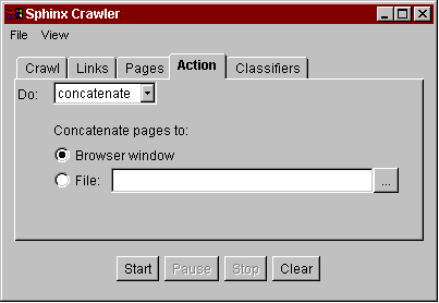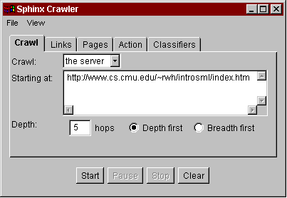 SPHINX has a graphical user interface called the Crawler Workbench that supports developing, running, and visualizing crawlers in a Web browser. A number of commonly-used shouldVisit and visit operations are built into the Workbench, enabling the user to specify and run simple crawls without programming. The Workbench can run any SPHINX crawler, as long as it inherits from the basic Crawler class.