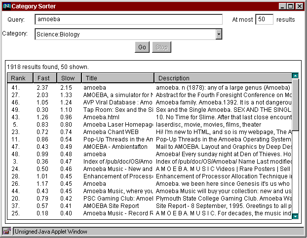 Figure 3: Results of an AltaVista query, ordered by similarity to Biology. "Rank" shows AltaVista's original ranking (where the first result returned has rank 1). "Fast" shows the category-similarity score of the brief description. "Slow" shows the score of the full page. The three pages with the highest "Slow" scores are relevant to the unicellular organism, despite appearing rather late in AltaVista's ranking.