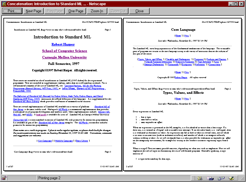 An example of using the customizable crawler for a personal crawling task is shown in Figure 1. The task is to print a hardcopy of Robert Harper's Introduction to Standard ML, a Web document divided into multiple HTML pages. In the Crawler Workbench, the user enters the first page of the document as the starting URL and sets some gross limits, constraining the crawler to a single Web server and pages at most 5 hops away from the starting URL (Figure 1a). Unfortunately these limits are not sufficient, because the document contains links to pages outside the document (such as Standard ML at Carnegie Mellon) which we don't want to print. A little investigation indicates that all the relevant pages have the prefix "http://www.cs.cmu.edu/~rwh/introsml/", so the user specifies this constraint as a regular expression on URLs that the crawler may follow (1b). Running the crawler produces a graph visualization of the Web pages visited (1c), which the user can browse to check that the appropriate pages are being retrieved. This appears to be the case, so (1d) the user specifies that the crawler should now concatenate the visited pages together to make a single page that can be printed (1e). This example shows how the Crawler Workbench provides a visual, interactive, iterative development environment for Web crawling.