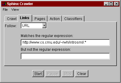 Here is an example of a simple crawler. This crawler only follows links whose URL matches a certain pattern, where pattern-matching is handled by the abstract Pattern class. Several subclasses of Pattern are provided with SPHINX, including Wildcard (Unix shell-style wildcard matching, used in the example below), Regexp (Perl 5-style regular expressions), and Tagexp (regular expressions over the alphabet of HTML tags).