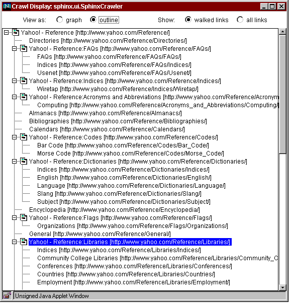 While a crawler is running, the Workbench dynamically displays the growing crawl graph, which consists of the pages and links the crawler has encountered. Two visualizations of the crawl graph are available in our prototype (Figure 2). First is a graph view (2a), which renders pages as nodes and links as directed edges, positioned automatically by a dynamic polynomial-approximation layout algorithm [Tunkelang97]. Nodes are displayed concisely, as icons. To get more information about a node, the user can position the mouse over an icon, and the page title and URL will appear in a popup "tip" window. The user can also drag nodes around with the mouse to improve the layout, if desired. The second visualization is an outline view (2b), which is a hierarchical list of the pages visited by the crawler. A page can be expanded or collapsed to show or hide its descendents. Both views are linked to the Web browser, so that double-clicking a page displays it in the browser. The availability of dynamic, synchronized views of the crawl proves to be very valuable as the user explores a site and builds a custom crawler for it.
