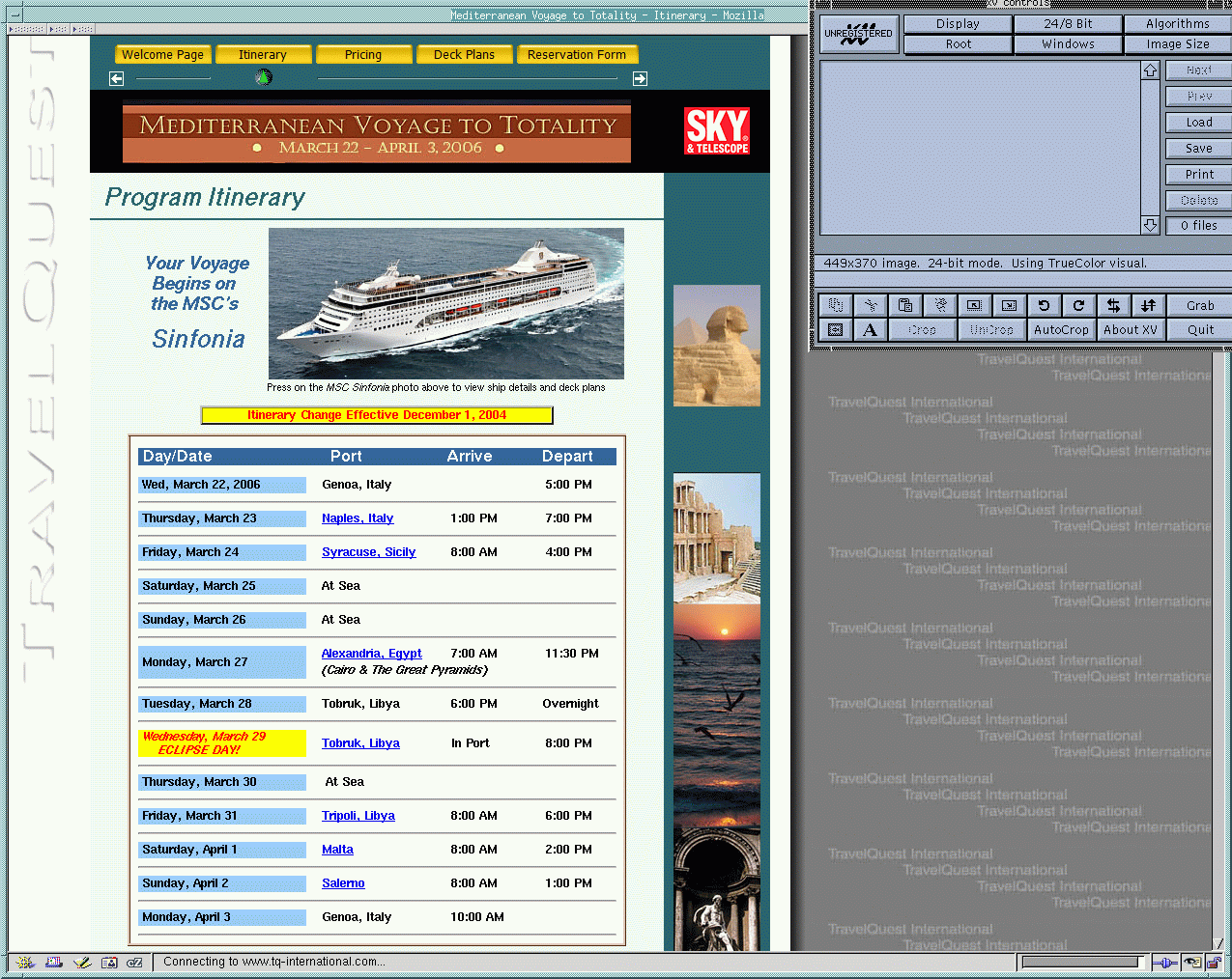 Wednesday, March 22 Genoa, Italy Thursday, March 23 Naples, Italy Friday, March 24 Syracuse, Sicily Saturday, March 25 At Sea Sunday, March 26 At Sea Monday, March 27 Alexandria, Egypt (bus to the Pyramids) Tuesday, March 28 Tobruk, Libya March 29: ECLIPSE DAY! Tobruk, Libya Thursday, March 30 At Sea Friday, March 31 Tripoli, Libya Saturday, April 1 Malta Sunday, April 2 Salerno, Italy Monday, April 3 Genoa, Italy