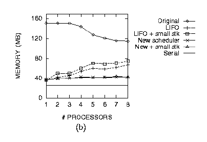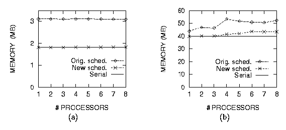 Since this algorithm involves dynamic memory allocation (in phase 3), we measured its space requirement with the original and new versions of the Pthreads implementation (see Figure 9(a)). As with matrix multiply, the new scheduling technique results in lower space requirement. The speedups with respect to the serial C version are included in Figure 8.