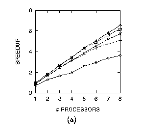 We ran a one-dimensional DFT of size N = 225 in our experiments, using either p threads (where p = no. of processors), or 256 threads. Figure 10 shows the speedups over the serial version of the code for one to eight processors. Note that when p is a power of two, the problem size (which is also a power of two) can be uniformly partitioned among the processors using p threads, and being a regular computation, it does not suffer from load imbalance. Therefore, for p = 2, 4, 8, the version with p threads runs marginally faster. However, for all other p, the version with a larger number of threads can be better load balanced by the Pthreads implementation, and therefore performs better. This example shows that without any changes to the code, the performance becomes less sensitive to the number of processors when a large number of lightweight threads are used. The performance of this application was comparable with both the original and the new Pthreads schedulers (see Figure 8).