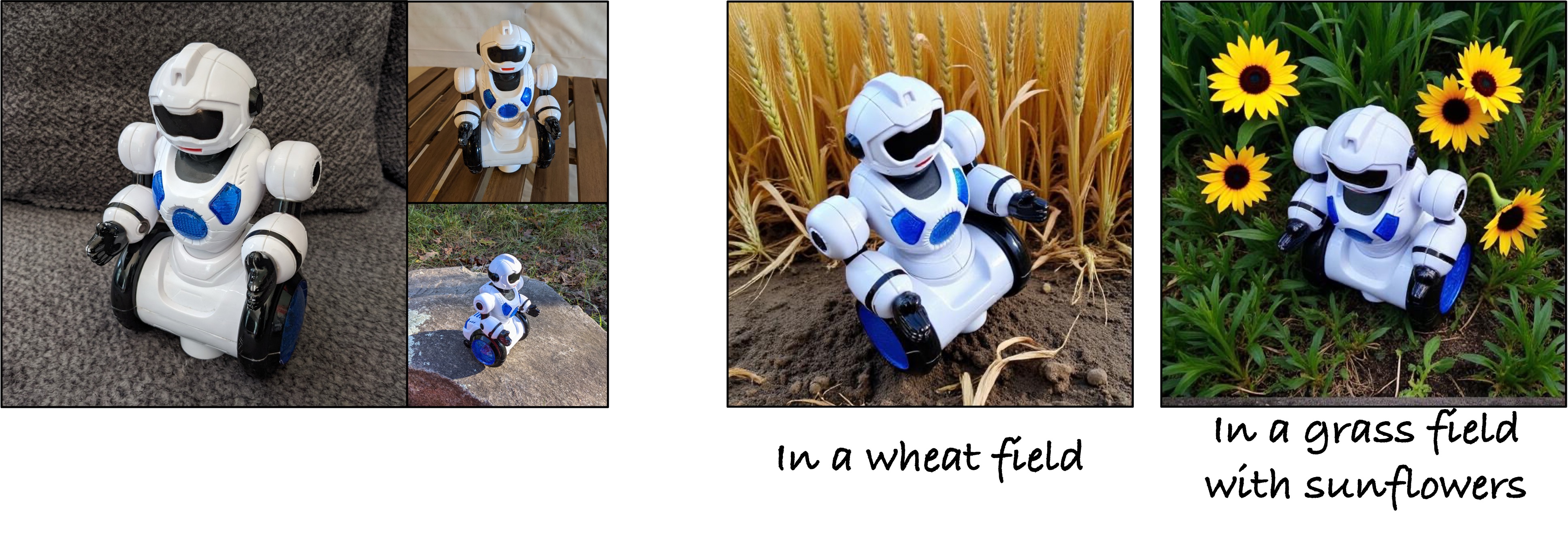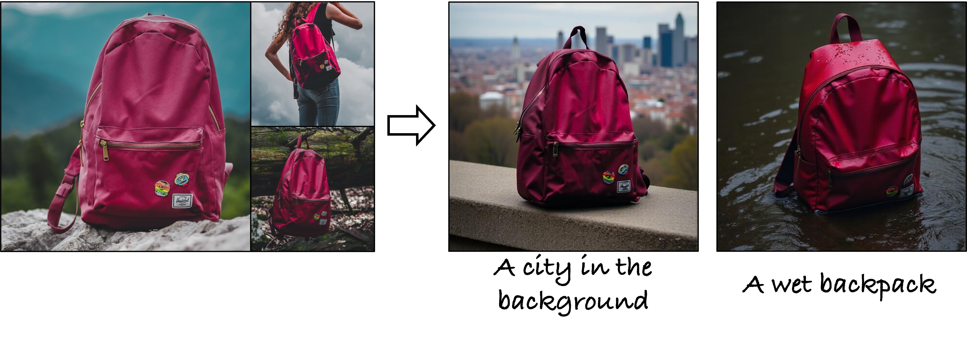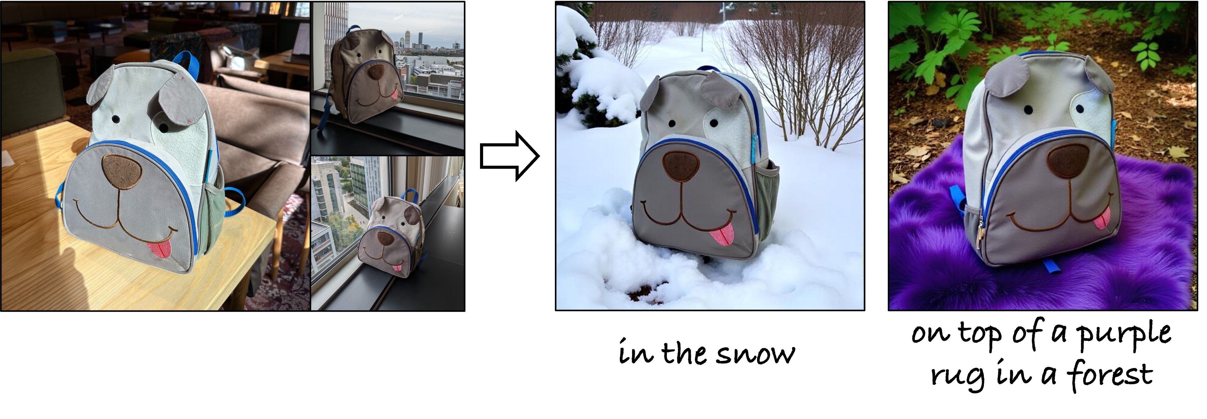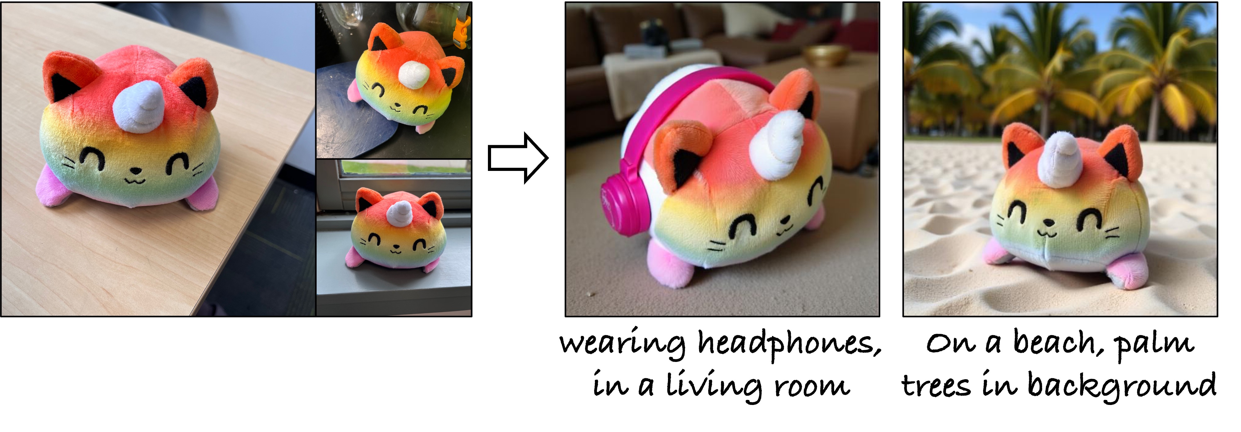 Results with one (top) and three reference images (bottom) as input. Our method can successfully incorporate the text prompt while preserving the object identity similar to or higher than the baseline methods. We pick the best out of four sampled images for all methods
