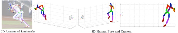 Figure 1. Given the 2D locations of anatomical landmarks in a single image we reconstruct the 3D human pose and relative camera location.