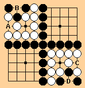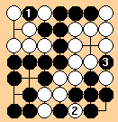 This situation arises in a variation of the Large Avalanche joseki, here reproduced in miniature.